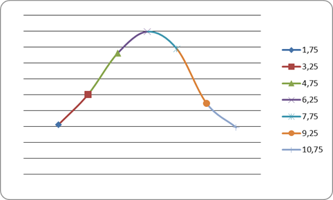 Максимальное значение абсолютной разности накопленных частот равно 2,256. По формуле делим его на n=40 и получим D=0,0564. Найдем табличное значение критерия с уровнем значимости α=0,05 и степенью свободы n=40. Следовательно, исходные данные соответствуют нормальному распределению, т.к. Т.о., второй метод подтверждает наличие нормального распределения выборки. Построение графика распределения частот Для построения графика распределения частот используем данные таблицы 1.3. В качестве абсциссы берем координаты 1. Выполним команду ВСТАВКА из верхнего меню. Выберем пиктограмму Точечная и в появившемся окне вид плавной кривой с точками. 2. В верхней ленте выбрать команду Выбрать данные. Появится окно Выбор исходных данных. После чего выделяем столбец D 24: D 30 нажимаем клавишу Ctrl на клавиатуре и, опуская ее, выделяем столбец E 24: E 30. Щелкнем по команде ОК . Появится изображение графика.