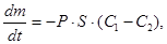 Знак минус в правой части уравнения показывает, что диффузия происходит из области большей концентрации в область меньшей концентрации вещества. «D» называется коэффициентом диффузии. Коэффициент диффузии численно равен количеству вещества, диффундирующего в единицу времени через единицу площади при градиенте концентрации, равном единице. «D» зависит от природы вещества и от температуры. Он характеризует способность вещества к диффузии. Так как концентрационный градиент клеточной мембраны определить трудно, то для описания диффузии веществ через клеточные мембраны пользуются более простым уравнением, предложенным Коллеидером и Берлундом: