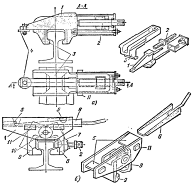 Рис. 6 Рельсовые противоугонные устройства а – центральный захват тискового типа; б – то же, полуавтоматический; в – противоугонный клин при работе крана; г – то же, во время стоянки 1 – корпус; 2 – болт; 3 – подвижная губка; 4 – ограниченная шайба; 5 – упор; 6 – клин (съемный); 7 – прижимная губка; 8,9 – губки-рычаги; 10 – ось; 11 – бобышка; 12 – клин противоугонный; 13 – плужок сбрасывающий; 14 – цепочка; 15 – ходовое колесо. Тележка оснащена центральным рельсовым захватом 17, размещенным между колесами непосредственно под шкворнем. Благодаря этому ходовой тележке достаточного одного захвата. Захват имеет губки, постоянно подведенные под головку рельса. Они препятствуют сходу крана с рельсов и развороту тележки при отрыве ее от рельса, когда кран работает на плохо уложенных путях. В настоящее время на многих кранах серии КБ установлены захваты тискового типа (рис.6 а). Эти захваты требуют применения для крановых путей специальных стыковых рельсовых накладок. Для работы с обычными железнодорожными накладками применяются полуавтоматические захваты (рис.6 б). Такой захват состоит из сварного корпуса 1 с бобышками 11, которыми он опирается на выступы в центральном проеме ходовой тележки. К корпусу шарнирно прикреплены рычажные губки 8 и 9, причем ось 10 их шарнира выбрана так, чтобы при восприятии отрывающей нагрузки губки не соскакивали с головки рельса. Для фиксации крана в нерабочем состоянии необходимо вставить клин 6 и затянуть болт 2. Для ускорения фиксации крана на путях в настоящее время применяют полуавтоматические захваты без съемных клиньев 6 и болтов 2, но с клиньями 12, подставляемыми под колеса (рис.6 в,г). Противоугонные клинья 12 тележек представляют собой металлический клин с приваренной ручкой. Во время работы крана клин располагается на металлоконструкции тележки, а для остановки крана и закрепления его в нерабочем состоянии клин подводится под колесо 15.