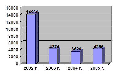 Рис. 2.1 - Количество произведенных подшипников в динамике Резкое снижение количественных показателей выпуска на «МП» по сравнению с 2002 годом вызвано отказом от производства миллионов нерентабельных мелких подшипников. Выручка от реализации продукции в 2002 году составила 1268604 тыс. руб., в 2003 году данный показатель равнялся 991620 тыс. руб., а в 2004 году данный показатель составил 1044596 тыс. руб. Прибыль (убыток) до налогообложения: в 2002 г. получена прибыль в размере 73101 тыс. руб.; в 2003 г. убыток составил 12893 тыс. руб.; в 2004 год также получен убыток в размере 3540 тыс. руб. Таким образом, несмотря на то, что результатом финансово-хозяйственной деятельности ОАО «Московский» в 2004 г. является убыток, завод улучшил свои показатели по основной деятельности по сравнению с 2003 годом. Убыток от продаж в 2004 году снизился на 16%. Относительное ухудшение финансово-экономического положения завода по сравнению с 2002 годом объясняется отвлечением ресурсов предприятия на проводимую реконструкцию и неблагоприятной конъюнктурой на рынках подшипниковой продукции. Но все же, несмотря на некоторое улучшение положения завода в 2004 году по сравнению с предыдущим годом и завершением реструктуризации, с самого начала 2004 года завод не выполнил план производства. Итоги работы ОАО «Московский» в 2004 году выглядят следующим образом. План по количеству выполнен на 86,9%, по стоимости – на 83,6% (Рис. 2.2).