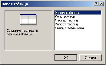 На екрані з’явиться вікно діалогу “Файл новой базы данных”. Вибираємо папку, в якій буде збережена нова база даних, а в полі “Имя файла" вводимо ім’я бази даних “Послуги та клієнти”. Натискаємо кнопку “Создать”. Відкривається вікно бази даних. Вікно бази даних має сім вкладок. В цьому вікні створюються об’єкти бази даних. Всі вони будуть розташовані на вкладках, які відкриваються під час вибору відповідного ярлика. Таблиця є основою бази даних. В MS Access вся інформація вміщується у таблицях. Приступимо до створення таблиць в MS Access, яке відбувається у вікні бази даних. Спочатку відкриваємо вікно створеної бази даних та переходимо на вкладку “Таблицы”. Натискаємо кнопку “Создать” у вікні бази даних. Відкривається вікно діалогу “Новая таблица”, в правій частині якої знаходиться список варіантів подальшої роботи. Для створення нової таблиці в конструкторі таблиць обирають “Конструктор”, після чого натискаємо “ok”. Створення таблиць у режимі конструктора дає широкі можливості щодо визначення параметрів таблиці. послуга зв'язок база access