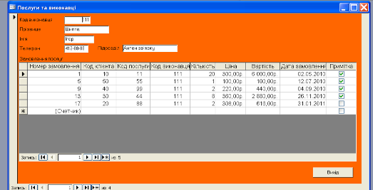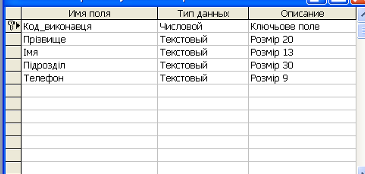 І нарешті створюємо таблицю “Виконавці послуг”. Поле “Код виконавця" з типом даних “Числовой”, індексоване поле “Да (Совпадения не допускаются) ”, робимо ключовим для зв’язку з таблицею “Замовлення послуг”. Для полів “Прізвище”, “Ім’я”, “Підрозділ”, “Телефон” обираємо текстовий тип даних розміром 20, 13, 30, 9 відповідно.
