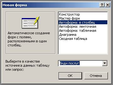 Розпочнемо зі створення форми “Види послуг”. Перейдемо на вкладку “Формы” і натиснемо кнопку “Создать”. Відкривається діалогове вікно “Новая форма”. В комірці “Выберите в качестве источника данных таблицу или запрос” вибираємо таблицю “Види послуг”. Зі списку вибираємо “Автоформа: ленточная" і натискуємо “ok”.