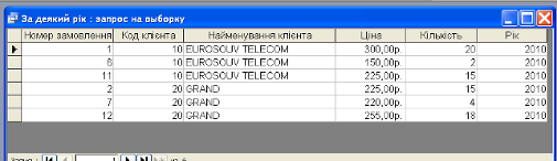Для перегляду запиту натиснемо на режим таблиці. Порядок створення останнього запиту аналогічний попередньому, але замість поля “Дата замовлення” створюємо поле “Рік”. Зайдемо в “Построитель выражений”, натиснувши на відповідну кнопку на панелі інструментів. Вибираємо “Встроенные функции”, два рази натиснувши на “Функции”, і зі списку вибираємо “Year”. Виділяємо “number" і зі списку полів таблиці “Замовлення послуг” вибираємо поле “Дата замовлення”. Натискаємо “ok" і зберігаємо запит під назвою “За деякий рік”.