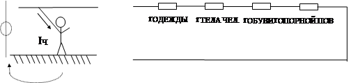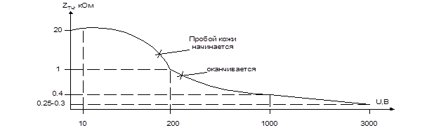 С=0.03 мкФ на 1дм контактной площади контактов. Rвн - небольшое сопротивление + С - несколько пФ не учитывается. Сопротивление тела человека зависит от состояния кожи ( сухая - влажная; целая - поврежденная; чистая - грязная ), от площади и плотности контакта, от приложенного напряжения то есть Zт.ч. - нелинейная величина. Для расчетов принимают среднее значение Rт.ч. =1 кОм. Это соответствует большинству случаев включения тела человека в электрическую цепь.