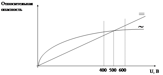 400 -600 В - примерно одинаковая опасность. 5) Частота тока. Наиболее опасным является переменный ток с частотой 40-60 Гц, так как частота собственных колебаний органов человека попадает в этот диапазон. 4. Факторы неэлектрического характера, влияющие на опасность поражения человека электрическим током 1). Длительность протекания тока через человека - чем больше время протекания тока, тем выше опасность. Зависимость тока и времени протекания тока через человека прямая так как: - с течением времени сопротивление человека падает; - с течением времени ослабляются защитные силы организма; - увеличивается вероятность совпадения максимума тока через область сердца с наиболее уязвимой фазой Т цикла.