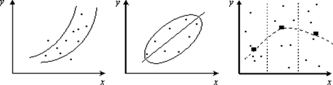 Рис. 3.4 Графически это поясняется на рис. 3.4, где по трем экспериментальным точкам построены регрессии y(x) и x(y), которые не совпадают. Для минимизации СКО трех экспериментальных точек от прямой, зависимость должна проходить через одну из них и в середине между двумя другими точками. Как видно из рис. 3.4, линейные регрессии, построенные из этих соображений пресекаются в центре области экспериментальных значений и имеют разный наклон. Быстрые методы построения функциональных зависимостей Задача выбора вида функциональной зависимости – задача неформализуемая, так как одна и та же экспериментальная зависимость может быть описана разными аналитическими выражениями приблизительно с одинаковой точностью. Например, U– образная кривая может быть описана как параболой, так и куском синусоиды. Основное требование к математической модели – компактность и удобство использования, потому чаще всего пользуются алгебраическими многочленами, экспоненциальными и тригонометрическими функциями. Другое требование – интерпретируемость. Например, если экспериментальная зависимость описывает изменение амплитуды затухающих колебаний, то функциональная зависимость может быть построена в виде Погрешность в выборе функциональной зависимости называется погрешностью адекватности модели. Для ее устранения надо рассматривать теоретическую модель описываемого явления или процесса. Быстрые методы установления графического вида однофакторных зависимостей. Простейший экспресс-метод статистической обработки – метод контура (рис. 3.5, а, б). Его суть – обведение экспериментальных точек плавными границами. Требование плавности подразумевает, что некоторые точки могут оказаться вне контура (рис. 3.5, а). Метод контура можно использовать тогда, когда разброс экспериментальных точек не слишком велик (рис. 3.5, б).