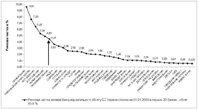 Рис.2.2. – Визначення ринкової частки загальних активів балансу АТЗТ “АК Промінвестбанк” в активах банківської системи України (158 діючих банків) станом на 01.01.2008 року В результаті за обсягом поточних і строкових депозитів фізичних осіб банк за 4 роки перемістився з 3 місця в БС України на 4 місце; г) абсолютний обсяг поточних і строкових депозитів юридичних осіб збільшився з 5,599 млрд.грн. до 10,786 млрд.грн., тобто зріс в 1,93 раза. Але при цьому ринкова частка обсягу поточних і строкових депозитів юридичних осіб в загальному обсягу поточних і строкових депозитів юридичних осіб банківської системи України зменшилась з рівня 11,93% у 2004 році до рівня 7,137% у 2007 році, тобто зменшилась в 1,67 раза. В результаті за обсягом поточних і строкових депозитів юридичних осіб банк за 4 роки перемістився з 1 місця в БС України на 2 місце; д) абсолютний обсяг чистого прибутку банку збільшився з 0,122 млрд. грн. до 0,234 млрд.грн., тобто зріс в 1,92 раза. Але при цьому ринкова частка обсягу чистого прибутку банку в загальному обсягу чистого прибутку банків-ської системи України зменшилась з рівня 9,31% у 2004 році до рівня 3,64% у 2007 році, тобто зменшилась в 2,55 раза. В результаті за обсягом чистого прибутку банк за 4 роки перемістився з 2 місця в БС України на 7 місце; е) рентабельність статутного капіталу банку(ROE) за рахунок стратегії капіталізації дивідендів в спеціальному фонді та постійному рівні статутного капіталу збільшилась з рівня 61,11% у 2004 році (5 рейтингове місце) до рівня 117,1 % у 2007 році (1 рейтингове місце), тобто зросла в 1,92 раза. Але при цьому рентабельність активів банку (ROA) зменшилась з рівня 1,154% у 2004 році (55 рейтингове місце) до рівня 0,898 % у 2007 році (45 рейтингове місце), що, за нормативами НБУ, характеризує банк як низькорентабельний. Таким чином, фінансовий важель залучених коштів в АТЗТ «АТ Промін-вестбанк» працює з високою ефективністю, але є значні резерви росту рента-бельності статутного капіталу за рахунок підвищення рентабельності роботи активів банку. Восени 2008 року Промінвестбанк зазнав значних втрат ліквідності внаслідок масового відтоку коштів клієнтів. З метою стабілізації діяльності та відновлення ліквідності банку 7 жовтня 2008 року Національним банком України в Промінвестбанку було призначено Тимчасову адміністрацію. 15 січня 2009 року Державна комісія з цінних паперів та фондового ринку видала Свідоцтво про те, що випуск акцій Промінвестбанку на загальну суму 1 мільярд 300 мільйонів 175 тисяч гривень внесено до Загального реєстру випуску цінних паперів. Реєстраційний номер - №505/1/08, дата реєстрації - 30 грудня 2008 року. Відповідно до результатів викупу додаткової емісії акцій Державна корпорація "Банк розвитку та зовнішньоекономічної діяльності (Зовнішеконом-банк)" (Росія) отримала контроль над 75 відсотками акцій Акціонерного комерційного промислово-інвестиційного банку (Промінвестбанк). На сьогодні найбільшими акціонерами банку є Державна корпорація "Банк розвитку та зовнішньоекономічної діяльності (Внєшекономбанк)" (Росія) - 75 % акцій, та ТОВ Сігнус (дочірня компанія SLAV AG) - 12,37 % акцій. 19 березня 2009 року призначено новий склад Правління Промінвестбан-ку. Наказом Тимчасового адміністратора Промінвестбанку від 16 березня 2009 року №95-к Головою Правління Промінвестбанку призначено Віктора Башкі-рова. 19 березня 2009 року наказом Тимчасового адміністратора від