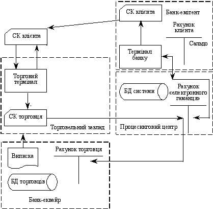 Рис.2.12. Схема розрахунків з використанням смарт-картки (СК) типу «електронний гаманець» Для захисту інформації при картковій системі розрахунків застосовується повний набір апаратних, програмних і організаційних засобів для забезпечення керування всіма складовими системи, у тому числі інтелектуальними картками, терміналами, інкасацією трансакцій, клірингом, а також інтерфейсом та інтеграцією з банківськими системами. Для технічного керування роботою системи використовуються два системних списки: так звані «зелений листок» та «стоп-листок». «Зелений листок» містить список банків-емітентів учасників системи. Він є у всіх банках і терміналах. Коригує цей список і поширює його в системі ГПЦ. «Стоп-листки» містять картки, які заборонені для обробки в системі. Картки включаються в «стоп-листки» у разі втрати або крадіжок на підставі заяв клієнтів (письмових або телефоном). Іноді (у разі підозри щодо підробки) самі банки чи процесингові центри вдаються до таких дій. «Стоп-листки» бувають двох видів: «стоп-листок» операцій, які виконуються в режимі прямого («он-лайн») доступу, та «стоп-листок» операцій непрямого («оф-лайн») доступу. Перший потрібен, щоб система емітента перевіряла картки під час їх завантаження та платежів із банківських рахунків. Він, по суті, захищає поточні рахунки клієнтів. Картки практично ніколи не вилучаються з цього списку (окрім випадків коли власник знаходить втрачену картку). «Стоп-листок» непрямого доступу використовується при платіжних операціях у терміналах і захищає залишки на ЕГ та ЕЧ. Захист даних у системі базується на використанні криптографічних методів при їх обробці, зберіганні та передаванні і передбачає розмежування доступу до інформації службових осіб. Криптографічні методи захисту інформації гарантують незмінність її змісту та обмеження доступу до неї. При захисті даних використовується також ключова система, яка передбачає наявність і використання системних і банківських ключів. Банки-учасники генерують свої ключі, самостійно застосовуючи модулі безпеки, які встановлюються під час запуску АКС. У картках записують відразу кілька версій ключів (системних та банківських). Картка і система можуть переходити на іншу (старшу) версію ключів у плановому або позаплановому порядку. Згідно « Положення про захист інформації в Національній системі масових карткових електронних платежів» [ ] в внутрішній картковій платіжній системи АКБ «Промінвестбанк» ВСКП застосовані основні принципи побудови захисту інформації : 1. Система захисту ВСКП «ПРОМІНВЕСТ» складається з комплексу апаратно-програмних засобів криптографічного захисту та ключової системи до них, технологічних і організаційних заходів щодо захисту інформації в ВСКП «ПРОМІНВЕСТ». 2. Питання захисту інформації в ВСКП «ПРОМІНВЕСТ» розглядаються на всіх етапах розроблення, впровадження та експлуатації програмно-техніч-ного забезпечення ВСКП «ПРОМІНВЕСТ» і включають чіткий розподіл відпо-відальності на кожному етапі підготовки, оброблення та виконання електрон-них банківських документів на всіх рівнях. 4. Частина інформації, що використовується та обробляється в ВСКП «ПРОМІНВЕСТ», відповідно до статті 61 Закону України "Про банки і банківську діяльність" є "банківською таємницею". 5. Основною метою криптографічного захис