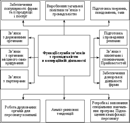 Цілеспрямована інформація про якість товарів, ціни на них і терміни їх доставки до покупця може бути забезпечена лише за наявності досконалої системи ЗЗГ із сучасними каналами комунікації, надійного прямого і зворотного зв’язку з цільовими аудиторіями. Комерційна товарна інформація, тобто відомості про товар, призначені для створення споживчих переваг, переконливо визначає вигоди від використання конкретного товару, тому має особливу значущість. У зв’язку з цим кожне повідомлення про товари, яке пропонується цільовим аудиторіям (покупцям, споживачам), повинно бути продуманим, обґрунтованим, цілеспрямованим і зрозумілим, нести доброзичливе ставлення до споживачів. Тобто повідомлення і звернення в комерційній діяльності мають сприяти формуванню дружнього образу фірми, пояснювати її готовність задовольняти розумні вимоги споживача, захистити його від несправедливості, допомогти у розв’язанні тих чи інших проблем. В сучасних умовах зв’язки з громадськістю в комерційній діяльності використовується переважно як процес діалогу й досягнення компромісу між компанією (фірмою) та її цільовими аудиторіями на користь усіх учасників процесу. Практично це новий підхід до налагодження і здійснення плідних відносин зі стратегічно важливими групами населення. На жаль, не всі розуміють, що успіху в будь-якій справі можна досягнути лише у взаємодії з усіма учасниками процесу виробництва, обміну, розподілу і споживання, чому сприяє правильне розуміння інтересів усіх сторін та взаємодопомога в їх реалізації. У комерційній діяльності служба зв’язків з громадськістю виконує цілу низку специфічних функцій. Передусім фахівці з паблік рілейшнз розробляють і пропонують керівництву фірми (корпорації) науково обґрунтовану концепцію політики у сфері зв’язків з громадськістю, враховують пропозиції, приймаючи рішення не лише з проблем паблік рілейшнз, а й з інших напрямів функціонування фірми. Дуже важливою функцією служби ЗЗГ є підготовка звернень, повідомлень, заяв, відповідей, що стосуються інтересів фірми в усіх напрямах її діяльності. Формування пабліситі (популярності) фірми загалом і видів її продукції зокрема також є однією з важливих функцій ЗЗГ у комерційній діяльності. Однією з функцій паблік рілейшнз є забезпечення зв’язків з державними органами (законодавчими, юридичними, податковими, контрольними та ін.). До важливих функцій служби зв’язків з громадськістю в комерційній діяльності належать: зв’язки з клієнтами і споживачами, з місцевим населенням, донорська діяльність, організація й проведення прийомів, координація та інтегрування всіх напрямів комерційної діяльності, робота друкованих органів для персоналу компаній (газети, прес-бюлетені, оголошення, рекламні буклети та ін.). Підготовка і розповсюдження рекламних матеріалів є особливою і дуже важливою функцією служби ЗЗГ у комерційній діяльності (схема 20). Схема 2 Функції служби зв’язків з громадськістю в комерційній діяльності