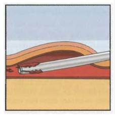 Это наиболее оптимальный вариант внутривенных катетеров со стальной иглой для длительного использования (приблизительно 24 ч.). Из всех металлических внутривенных катетеров они используются чаще всего. Среди этих катетеров выделяют следующие модификации: катетеры с уменьшенной длиной среза и длиной иглы (для уменьшения механического раздражения); с гибкой трубкой между иглой и коннектором (также с целью уменьшения механического раздражения - вынужденные манипуляции коннектора не передаются острому наконечнику иглы); с крылышками из мягкой пластмассы, между которыми интегрирована игла, что обеспечивает безопасный прокол даже при трудно доступных венах. В современной практике стальные катетеры употребляются крайне редко, так как они не подходят для долгосрочного пребывания в вене из-за высокой частоты осложнений, связанной с их использованием. Жесткость иглы обусловливает механическое раздражение (с дальнейшим развитием флебита или тромбоза), травматизацию и некрозы участков стенки вены с последующим экстравазальным введением препарата, формирования инфильтрации и гематомы. Вводимые через эти катетеры инфузионные среды вливаются в вену не по ходу тока крови, а под углом к нему, что создает условия для химического раздражения интимы сосуда. Острая игла создает абразивное действие на внутреннюю поверхность сосуда. Для уменьшения частоты этих осложнений при работе со стальными катетерами требуется надежная их фиксация, а достижение этого условия ограничивает двигательную активность пациента и создает ему дополнительный дискомфорт. Тем не менее, в использовании стальных катетеров есть преимущества. При их постановке снижается риск инфекционных осложнений, поскольку сталь препятствует проникновению микроорганизмов по катетеру. Кроме того, благодаря их жесткости, облегчается манипуляция пункции трудновизуализируемых и тонких вен. В педиатрии и неонатологии они являются катетерами выбора. Пластиковые катетеры состоят из соединенных между собой пластмассовой канюли и прозрачного коннектора, надвинутых на направляющую стальную иглу. Переход со стальной иглы на пластмассовую трубу у современных катетеров плавный или с небольшим коническим проектированием, чтобы в момент венепункции перемещение иглы происходило без сопротивления (рис.2). Рис.2. Переход между катетером и иглой-проводником