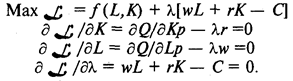 Производственную функцию можно представить как: Q = f (L, K). Функцию издержек можно определить как: С = wL + rK. Решение об объеме спроса на труд, максимизирующем прибыль работодателя, может быть получено с помощью максимизации функции Лагранжа для задачи максимизации выпуска при заданных издержках: