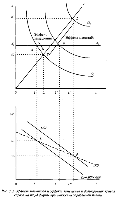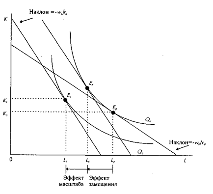 На рис. 2.4 показано действие эффекта масштаба и эффекта замещения при увеличении заработной платы. Однонаправленное действие этих эффектов приведет к сокращению спроса на труд. При первоначальной заработной плате w0 и выпуске продукта Q0 использовалось K0 капитала и L0 труда, что определялось точкой касания E0 изокванты Q0 и изокосты с наклоном – w0 / r0 . При увеличении заработной платы до w1 наклон изокосты составит – w1 / r0 . Для того же самого объема выпуска соотношение используемых факторов будет определяться точкой касания новой изокосты и прежней изокванты ES . В результате изменения относительных цен факторов, т.е. в результате эффекта замещения, спрос на труд сократится до LS , размер эффекта замещения составит (L0 -LS ).