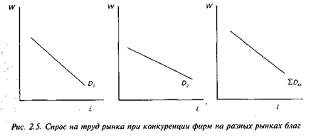 Рис. 2.4. Эффект масштаба и эффект замещения при росте заработной платы Помимо этого повышение заработной платы вызовет повышение издержек и сокращение выпуска продукта до Q1 . В итоге объем используемых факторов будет определяться точкой E1 , точкой касания изокванты Q1 и изокосты с наклоном – w1 /r0 . Эффект масштаба в этом случае выразится в сокращении спроса на труд с LS до L1 . Совокупное действие эффекта масштаба и эффекта замещения выразится в сокращении спроса с L0 до L1 . Замещение одного фактора производства другим в результате изменения относительных цен факторов производства определяется эластичностью замещения s: s = 3. Спрос на труд отрасли и рынкаВ случае, если фирмы конкурируют на одном рынке труда и на разных рынках благ, общий спрос на труд равен сумме спроса на труд отдельных фирм, DM = SDj На рис 2.5 это показано суммированием по горизонтали кривых спроса D1 и D2 отдельных фирм.