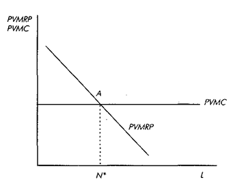 Рис. 2.9. Определение равновесного уровня занятости с учетом квазипостоянных издержек на труд Для каждого потенциально нанятого работника, то кривая PVMC отражает текущую стоимость предельных издержек на труд, или совершенно эластичное