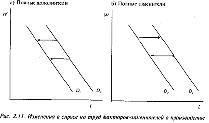 Рис. 2.10. Определение равновесного уровня занятости с учетом возрастающих квазипостоянных издержек на труд Точка А – точка пересечения кривых PVMRP и PVMC, определяет оптимальный уровень занятости N* при равенстве текущей стоимости предельного денежного продукта труда и текущей стоимости предельных издержек на труд, включающих квазипостоянные и переменные издержки (PVMRP=PVMC). Квазипостоянные издержки могут быть не равны для каждого работника. Можно предположить, что, чем большее количество работников нанимается, тем больше ресурсов на одного работника требуется потратить на наем и отбор. Тогда предельные квазипостоянные издержки – возрастающая функция от количества работников. Кривая текущей стоимости предельных совокупных издержек на труд PVMC при увеличении количества работников будет все больше отклоняться от кривой текущей стоимости переменных издержек на труд (заработной платы) PVW. Рисунок 2.10 показывает, что в этом случае количество нанятых работников N*, определяемое по-прежнему равенством текущей стоимости предельных издержек и текущей стоимости предельного денежного продукта труда (PVMRP = PVMC), будет меньше, чем в случае равных для каждого работника квазипостоянных издержек на труд. 7. Спрос на различные виды трудаПростая модель спроса на труд предполагает существование двух факторов – капитала и труда. Однако труд нельзя рассматривать как однородный – работники различаются по профессиям, квалификации, полу, возрасту. Расширение модели спроса на труд предполагает наличие, по крайней мере, труда двух видов – квалифицированного и неквалифицированного. Когда несколько видов труда являются факторами производства, нельзя говорить об одной эластичности спроса на труд в долгосрочном периоде. Работодатели по-разному реагируют на процентное изменение заработной платы различных групп работников. Спрос на труд работников, обладающих меньшим человеческим капиталом, более эластичен. Спрос на один вид труда может изменяться под воздействием изменения цен на другой вид труда (или капитала). Эластичность спроса на j-й фактор с учетом цены фактора k есть процентное изменение спроса на j-й фактор, вызванное относительным изменением (однопроцентным) цены фактора k. Если оба фактора являются видами труда, то перекрестная эластичность спроса по заработной плате будет выражена формулами: eDjk =% DLj /% DWk или eDjk = (¶Lj / Lj ) / (¶Wk / Wk ) и eDkj =% DLk /% DWj или eDkj = (¶Lk / Lk ) / (¶Wj / Wj ). Если перекрестная эластичность положительна, eDkj > 0 (с увеличением цены одного фактора увеличивается спрос на другой), то два фактора называются полными заменителями. Если перекрестная эластичность отрицательна, eDkj < О (увеличение цены одного фактора сокращает спрос на другой), эти факторы называются полными дополнителями. Являются ли факторы j и k полными заменителями или полными дополнителями, зависит от соотношения абсолютных значений эффекта замещения и эффекта масштаба. Если цена фактора j повышается, то возникает эффект замещения, при котором спрос на фактор k возрастает. Одновременно может возникнуть эффект масштаба, который приведет к сокращению производства, а следовательно, и уменьшению спроса на фактор k. Два вида ресурсов (например, два вида труда) могут также быть дополнителями или заменителями в производстве. Если большее использование одного из них приводит к ме