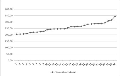 Отже, використовуємо метод аналітичного групування для розподілу господарств Вінницького району на однорідні групи. Групувальна ознака – урожайність (ц/га) зернових культур. Для того, щоб його визначити, необхідно по кожному господарству валовий збір поділити на посівну площу. На групувальну ознаку впливають такі фактори як затрати на 1га.(грн.), прямі затрати праці на 1 га(люд.-год.), оплата праці 1 люд.-год.(грн.). Для наочності відобразимо ранжирований ряд графічно. Для цього побудуємо Огіву Гальтона (рис. №1), в якій на осі абсцис буде - порядковий номер підприємства в ранжированому ряді, а на осі ординат - величина групувальної ознаки - урожайність зернових культур. Зростання собівартості від підприємства до підприємства відбувається поступово.