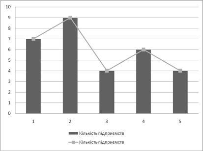 Рис.2 Гістограма і полігон За допомогою інтервального ряду розподілу побудуємо гістограму, на якій на осі абсцис розміщено - інтервал по урожайності, а на ординаті кількість підприємств у групі (рис.2). Гістограма - стовпчикова діаграма, яка застосовується для зображення інтервальних варіаційних рядів. Площа кожного стовпчика пропорційна частотам. Для рівних інтервалів ширину стовпчика беруть однакову, а висота пропорційна частотам. При нерівних інтервалах ширина стовпчиків має бути пропорційна величині інтервалу у кожній групі, а висота стовпчиків збільшується у стільки разів у скільки збільшується величина інтервалу. Таблиця 3. Зведені дані результативного групування технічних культур