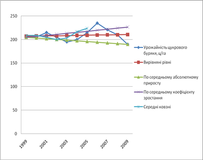 Дані таблиці показують, що урожайність технічних культур зменшилась на 7,32% а або на 15 ц/га. Абсолютне значення 1% приросту урожайностітехнічних культур протягом 1999-2009 рр. коливалося, а в останній рік (2009р.) становило 0,45 ц/га. Для подальшої характеристики динаміки досліджування урожайності зернових культур за період 1999-2009 рр. визначимо середні значення таких показників: середній рівень ряду динаміки