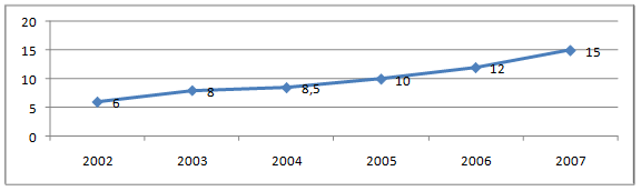 К моменту кризиса 64 % всего рынка производных инструментов приходилось на фондовые контракты. Причем наибольший объем рынка фондовых опционов приходился на американский континент (3 млрд. контрактов), фондовых фьючерсов – на Европу, Африку, Средний Восток, а индексных опционов – на азиатско-тихоокеанский регион. Торговый дисбаланс и инфляция доллара – вторая причина кризиса. Резервной валютой мировой банковской системы с послевоенного времени является доллар США, даже отмена его золотого обеспечения не изменила его роль как основной валюты международных торговых расчетов (65 %), международных резервов (62 %), валютообменных операций (78 %), производных инструментов и акций фондовых бирж (41 %), активов банков (42 %) (см. рис. 1, 2). Хотя безусловно наметилась тенденция замещения доллара евро – второй валютой, претендовавшей на роль мировой. Рис. 1. Рост на рынке деривативов (млрд. контрактов)