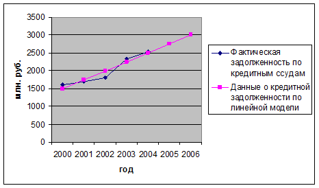 Линейная модель имеет вид: у = а1+ао·t. Найдем значения а1 и ао по формулам: а1 = (t¯·xt - x¯· t¯) / (t²¯- (t¯)²) = (6490.9 – 1995.78·3) / (11-3²) = 503.56 / 2 = 251.78; ао = x¯- a1· t¯ = 1995.78 – 251.78·3 = 1240.44. Получили линейную модель y = 1240.44+251.78t. Подставив в найденное уравнение t = 6, t = 7 получим точечные прогнозы на следующие два года. Прогнозная задолженность по кредиту на 2005 и 2006 соответственно равна 2751,12 и 3002,9 млн. руб.[2, с.298-317]. Фактические и расчетные данные по кредитной задолженности представлены в виде графика.