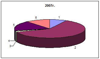 Рис. 2 – Структура вкладов и средств клиентов 1 – текущие счета физических лиц; 2 – срочные вклады физических лиц; 3 – расчётные счёта государственных и общественных организаций; 4 – срочные депозиты государственных и общественных организаций; 5 – расчётные счета прочих юридических лиц; 6 – срочные депозиты прочих юридических лиц. Как видно из диаграммы, срочные вклады физических лиц занимают большую долю в структуре средств клиентов банка, по состоянию на 31 декабря 2007 они составили 2379647 млн. руб. при общей сумме вкладов и средств клиентов 3877620 млн. руб. Следует отметить, что Сбербанк остаётся на протяжении многих лет лидером среди других коммерческих банков по привлечению средств физических лиц во вклады, т.к. заслужил репутацию надёжного банка. Наряду со вкладами в настоящее время одной из самых распространенных услуг банка является кредитование как физических, так и юридических лиц. По видам кредиты клиентам и средства в других банках можно разделить на следующие группы: 1 – коммерческое кредитование юридических лиц; 2 – специализированное кредитование юридических лиц; 3 – потребительские ссуды физическим лицам; 4 – жилищное кредитование физическим лицам; 5 – средства в других банках. Заметим, что кредитование юридических лиц занимают большую долю в общей сумме выданных банком кредитов, это объясняется, прежде всего, размером кредита, ведь на развитие даже одного предприятия необходимы большие объёмы вложений, нежели на потребительские цели частных клиентов банка. Представим структуру кредитов, выданных банком, в динамике двух последних отчётных лет.