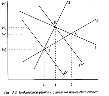 Для рынка в целом кривая предложения труда имеет положительный наклон. На рис. 3.1 а равновесие достигается при пересечении спроса DL и предложения SL в точке А для отдельной фирмы и на рис. 3.16 при пересечении спроса DLM и предложения SLM в точке В для рынка в целом. При изменении в спросе на труд или в предложении труда происходит подстройка рынка – процесс достижения новой точки равновесия, нахождение нового уровня занятости и заработной платы. Рассмотрим подстройку рынка труда в ответ на повышение спроса на труд. В первоначальный момент рынок находился в равновесии в точке А (рис. 3.2), с заработной платой W0 и занятостью L0 . Повысился спрос на труд, что сдвинуло кривую спроса на труд в краткосрочном периоде вправо от DS к D’S и привело к повышению заработной платы от W0 до W1 . В ответ в соответствии с краткосрочной кривой предложения труда SS уровень занятости увеличился до L1 , и новое равновесие рынка труда было достигнуто в точке В. Заработная плата возросла значительно, а занятость увеличилась незначительно. В долгосрочном периоде и спрос (DL ), и предложение (SL ) труда более эластичны. С одной стороны, растет предложение труда, на рынок входят новые работники, привлекаемые высокой заработной платой, с другой стороны, постепенно происходит замещение дорогостоящего труда капиталом. В результате долгосрочной подстройки заработная плата снижается до уровня W2 , а занятость повышается до уровня L2 , равновесие в долгосрочном периоде достигается в точке С. Для линейных функций спроса на труд и предложения труда заработная плата и занятость в точке равновесия будут определяться следующим образом: DL = а + bW – функция спроса на труд, b<0, SL = с + dW – функция предложения труда. Тогда в точке равновесия DL = SL = L* и а + bW = c + dW. Отсюда равновесная заработная плата равна W* = (а - с) / (d - b), где b<0.