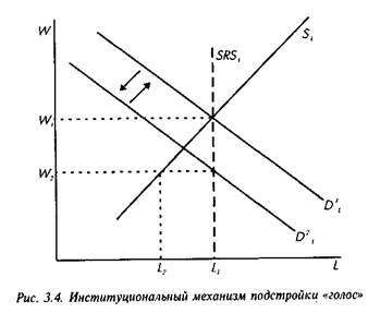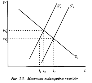 2. Подстройка рынка: «выход – голос»Рассмотренная подстройка рынка труда была основана на стандартной конкурентной модели рынка труда, где заработная плата и занятость определяются рыночным равновесием спроса и предложения, а это равновесие достигается за счет мобильности работников и гибкости цен. Такой механизм подстройки получил название «выход», в результате его действия устанавливается заработная плата, приводящая в равновесие спрос и предложение («очищающая» рынок труда). На рис. 3.3 на локальном рынке труда первоначальное равновесие спроса DL и предложения S1 L . достигается при заработной плате W1 и уровне занятости L1 . Если условия труда ухудшаются, то предложение труда сократится до S2 L , часть работников уволится и покинет этот рынок, и уровень занятости упадет до L2 . В ответ на это работодатель повысит уровень заработной платы до W2 , что привлечет обратно часть работников, и уровень занятости повысится до L3 , который будет новым равновесным уровнем занятости для спроса DL и предложения S2 L .