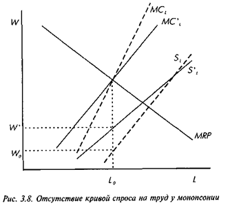 Первоначально рассмотрим спрос на труд в ситуации, когда олигопсонист на рынке труда не обладает монопольной силой на рынке благ. Рисунок 3.15 показывает ломаную кривую предложения труда с точкой перелома, соответствующей заработной плате W0 и занятости L0 . Кривая предложения труда сравнительно эластична на отрезке ab и менее эластична на отрезке bc. Это создает разрыв в кривой предельных издержек на труд MCL . Равновесие на таком рынке труда будет установлено при равенстве предельных издержек на труд MCL предельному денежному продукту труда, MRP1 , при уровне занятости L0 (или, более точно, MRP1 проходит через разрыв в MCL при данном уровне занятости). Любое движение кривой MRP между MRP1 и MRP2 не оказывает влияния на заработную плату и занятость. Следствием из этой модели являются жесткость заработной платы и сохранение уровня занятости в периоды циклического спада. В ситуации олигопсонии на рынке труда – олигополии на рынке продукта (рис. 3.16) вывод о жесткости заработной платы усиливается. Олигополист на рынке благ, сталкиваясь с ломаной кривой спроса на его продукт, имеет ломаную кривую среднего денежного продукта труда и разрыв в кривой предельного денежного продукта труда. Кривая спроса может теперь двигаться в определенном диапазоне, не оказывая влияния на заработную плату. Границы этого диапазона будут определяться при движении кривой спроса вверх совпадением точки в с точкой b, при этом точка а перемещается вверх и образует точку а’ (a’b = ad), a при движении кривой спроса вниз – совпадением точки а с точкой с, перемещением точки в вниз и образованием точки d’ (сd’ = ad). Общая величина диапазона жесткости заработной платы составит a’d’ = a’b + bc + cd’ = 2ad + bc. Жесткость заработной платы теперь еще сильнее, так как два разрыва (в кривой предельных издержек и в кривой предельного денежного продукта) накладываются друг на друга.