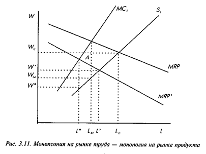Рис. 3.9. Комбинации структуры рынка труда и рынка благ И так как h < 0, а Р > 0, W > 0, MPL > 0, то спрос на труд монополии D’L = MRP = MPL * MR для каждого уровня заработной платы меньше спроса на труд фирмы, находящейся в ситуации совершенной конкуренции на рынке благ DL = MRP = MPL * P. Как видно на рис. 3.10, кривая спроса на труд для монополии D’L расположена ниже и она менее эластична, чем кривая спроса на труд DL для конкурентного рынка продукта фирмы. Так как отдельная фирма-монополист на рынке продукта находится в конкурентной ситуации на рынке труда, то она сталкивается с горизонтальной кривой предложения труда. В результате уровень занятости L’ для монополии меньше, чем занятость L0 для фирмы, не обладающей монопольной властью на рынке продукта. Монопсония на рынке труда – монополия на рынке благ является комбинацией описанных ситуаций. В этом случае на рынке труда возникают эффекты как монопсонии, так и монопольного положения фирмы на рынке продукта. Из условия максимизации прибыли следует: MRP’ = MSL . В условиях монополии R = P(Q)*Q. В условиях монопсонии C(L) = W(L) L. MRP’= (P + ¶ P/¶ Q*Q) MPL = P (1+¶ P/ ¶ Q*Q / P) MPL = P (1 + 1 / h) MPL MCL = ¶ C/ ¶ L = W + L* ¶ W / ¶ L = W (1 + L / W * ¶ W / ¶L) = W (1 + 1 / eS ) P (1 + 1 / h) MPL = W (1 + 1 / eS ), или MRP’= MCL .