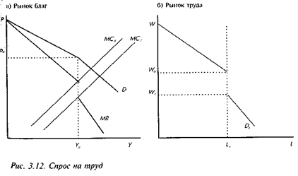 На рис. 3.11 равновесному решению в условиях монополии на рынке благ и монопсонии на рынке труда соответствует точка А (MRP’ = MCL ), уровень занятости при этом будет равен L*, он меньше, чем уровень занятости для ситуации конкурентный рынок труда – конкурентный рынок благ (L0 ). чем уровень занятости для ситуации конкурентный рынок труда – монополия на рынке продукта (L’), чем уровень занятости для ситуации монопсония на рынке труда – конкурентный рынок благ (LM ). Заработная плата W* будет определяться кривой предложения труда SL в соответствии с уровнем занятости L*. Она также меньше заработной платы для случая конкуренции (W0 ), монополии (W’), монопсонии (WM ). 6. Спрос на труд в ситуации олигополии на рынке благ Олигополия – это тип рыночной структуры, при которой на рынке существует небольшое ограниченное количество продавцов. Конкуренция и взаимозависимость фирм в ситуации олигополии одинаково важны (кроме экстремальных случаев договорной олигополии, которая приобретает форму совместного извлечения прибыли, когда рыночная ситуация аналогична ситуации с монополистом, владеющим многими предприятиями). Теория олигополии предполагает анализ взаимного поведения фирм с позиции теории игр, поэтому вывод простой функции спроса на труд в общем случае представляется проблематичным. Рассмотрим спрос на труд олигополии в частном случае, когда олигополистическая фирма имеет ломаную кривую спроса на рынке благ. На рис. 3.12а показано, что при текущем рыночном выпуске Y0 (определяемом равенством МС = MR) кривая спроса имеет явный перелом. Если фирма снижает свою цену, при прочих равных условиях ее конкуренты будут вынуждены снизить свои цены и кривая спроса на продукт фирмы будет относительно неэластична; если, наоборот, фирма повышает свою цену, то конкуренты не обязаны следовать за ней, и спрос на продукт фирмы станет относительно эластичным. При этих обстоятельствах фирма сталкивается с ломаной кривой спроса на продукт при текущей равновесной цене p0 . Однако ломаная кривая спроса на продукт не только предполагает взаимосвязь между ценами на продукт и выпуском, но и между заработной платой и занятостью. Перелом на рис. 3.12а происходит при равновесном уровне выпуска Y0 , который связан с применением L0 труда (рис. 3.12б). Как и в случае монополии, у олигополии цена на продукт непостоянна при разных объемах выпуска, поэтому кривая предельного дохода MR отклоняется от кривой спроса D, но так как кривая спроса имеет перелом, то кривая предельного дохода будет иметь разрыв при выпуске Y0 . Тогда кривая предельного денежного продукта труда, т.е. кривая спроса на труд DL , также не непрерывна в точке L0 , и равновесие