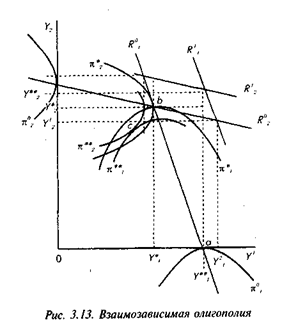 происходит на пересечении MRPL и W0 (более точно, W0 проходит через участок разрыва кривой MRPL ). После снижения уровня заработной платы с W0 до W1 фирма обнаруживает, что ее предельные издержки на производство единица продукта снизились с MC0 до MC1 (рис. 3.12а). Тем не менее оптимальный размер выпуска не изменился, и изменение заработной платы не ведет к изменению в спросе фирмы на труд. Однако немного большее сокращение ставки заработной платы заставило бы фирму переместиться вниз по MR (рис. 3.12а), и аналогично вниз по DL (рис. 3.12б). Теория олигополии на основе ломаной кривой спроса показывает, что по крайней мере в краткосрочном периоде олигополистический спрос на труд может быть жестким даже при существенных изменениях в заработной плате (в то же время необходимо отметить, что эта теория не объясняет возникновение ситуации первоначального равновесия). Модель взаимозависимой олигополии. Есть несколько моделей олигополии, которые пытаются объяснить равновесную позицию фирмы на основе специфической кривой рыночного спроса на продукт и заданного набора поведенческих правил, которые лежат в основе реакции одной фирмы на поведение ее конкурентов. Например, модель Курно предполагает, что каждая фирма ведет себя так, как будто ее конкуренты собираются поддерживать выпуск на постоянном уровне; в модели Бертрана каждая фирма предполагает, что ее конкуренты поддерживают цены на постоянном уровне. Следовательно, каждая фирма имеет набор уровней выпуска (в модели Курно) или уровней заработной платы (в модели Бертрана), которые максимизируют их прибыли при соответствующих выбранных конкурентами уровнях выпуска или цен. Этот набор оптимальных точек лежит вдоль кривой реакции каждой фирмы. Для определенных относительных наклонов кривых реакции их пересечение может быть показано как устойчивое равновесие. Простая модель дуополии Курно показана на рис. 3.13. Кривые p1 и p2 – линии изоприбыли соответственно для фирмы 1 и 2. При каждом уровне выпуска своих конкурентов фирма пытается достичь наивысшей прибыли. Это происходит путем выбора линии изоприбыли, ближайшей к горизонтальной оси для фирмы 1, и ближайшей к вертикальной оси для фирмы 2. Из-за формы линий изоприбыли они всегда включают наивысшую точку U-образной кривой. Таким образом, если фирма 2 выбирает Y2 = 0, фирма 1 выбирает точку а на p0 1 ; если фирма 2 выбирает Y*2 , фирма 1 выбирает точку b на p*1 , чем ниже выпуск конкурента, тем больше прибыль для другой фирмы. Таким образом, фирма 1 может зарабатывать p0 1 , если Y2 = 0 (т.е. фирма 1 является монополистом), и аналогично фирма 2 может получать p0 2 , если Y1 = 0. Следовательно, p*1 < p0 1 и p*2 < p0 2 . Объединение наивысших точек p1 дает кривую реакции фирмы 1 R0 1 . Кривая реакции – это набор выпусков фирмы 1, которые она выберет в зависимости от заданного выпуска фирмы 2. Аналогично объединение наивысших точек p2 дает R0 2 – набор выпусков, которые предпочтет фирма 2 при данном выпуске фирмы 1. Единственная комбинация выпуска, которая удовлетворит обе фирмы, произойдет в точке b, где R0 1 пересекается с R0 2 . Таким образом, в условиях конкуренции равновесные уровни выпуска составят Y*1 и Y*2 . Они будут определять спрос фирм на труд в условиях равновесия. Отметим, однако, что существует точка, более благоприятная для одной или для обеих фирм. Если фирмы заключат тайный сговор, то они смогут пер