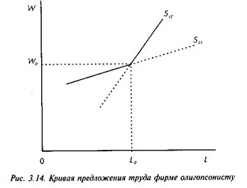 Что произойдет со спросом на труд при снижении заработной платы? Во-первых, снижение заработной платы ведет к нормальным эффектам замещения, т.е. к более высокому спросу на труд и более низкому спросу на капитал. Величина этого эффекта зависит от эластичности замещения. Во-вторых, сокращение заработной платы влияет на выпуск. Следовательно, если выпуск фирмы 2 равен Y*2 , то данный уровень прибыли, такой как p*1 может теперь быть достигнут при более высоком уровне выпуска фирмы 1. Другими словами, кривая реакции фирмы 1 сдвигается с R0 1 до R1 1 . Аналогично снижение заработной платы в фирме 2 выражается в сдвиге ее кривой реакции с R0 2 до R1 2 . Если только фирма 1 испытывает сокращение заработной платы, ее выпуск растет до Y2 1 , в фирме 2 снижается до Y1 2 . Таким образом, при прочих равных условиях фирма 1 увеличит, а фирма 2 сократит спрос на труд. Чистый эффект зависит от относительных наклонов кривых реакции, так же как лежащий в основе эффект замещения. Если мы сохраняем положение о конкурентных рынках труда, на обеих фирмах произойдет сокращение заработной платы. Новое равновесие возникнет в точке d, где R1 1 пересекает R1 2 . Выпуск теперь выше для обеих фирм и, если эффект замещения работает в том же направлении, спрос на труд будет расти. Таким образом, в случае взаимозависимой олигополии можно сделать несколько выводов о кривой спроса на труд. Первое: можно ожидать, что снижение заработной платы выразится в нормальном эффекте замещения в пользу труда и от капитала. Второе: можно показать, что (для нормальных кривых дохода и издержек) кривые реакции в модели Курно сдвигаются к северо-востоку, а кривые реакции в модели Бертрана сдвигаются к юго-западу, подразумевая более высокий уровень выпуска и спроса на труд для каждой фирмы, испытывающей сокращение заработной платы. Эффекты масштаба и замещения для независимого олигополиста действуют на спрос на труд в ожидаемом направлении. Наконец, при прочих равных условиях кривая спроса на труд, когда фирмы сотрудничают для достижения наивысшей прибыли, в целом будет ниже при каждом данном уровне заработной платы, чем в случае независимого олигополиста. 7. Олигополистический рынок труда Обычно в теории рассматриваются рыночные структуры, которые характеризуются экстремальными случаями рыночной власти. В реальном мире большинство рынков труда скорее характеризуются промежуточными уровнями рыночной власти, чем экстремальными. На стороне спроса на рынке труда ситуация олигопсонии, когда работники нанимаются относительно небольшим количеством работодателей, является наиболее распространенной формой рыночной структуры. Рассмотрим спрос на труд олигопсонии, опираясь на теорию ломаной кривой предложения. Предположим, что выполняются следующие предпосылки: не существует сговора между фирмами-олигопсонистами на рынке труда; фирма сталкивается с конкурентным предложением труда, не объединенным в профсоюз и не обладающим рыночной силой; рынок труда характеризуется совершенной мобильностью и информацией. Кривая предложения показана на рис. 3.14. Если W0 – существующая ставка заработной платы, то SL 1 – кривая предложения труда фирме-олигопсонисту при предположении, что никто из конкурентов не реагирует на любые изменения заработной платы, которые производит данная фирма. SL 2 – кривая предложения т