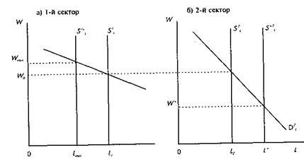 Рис. 3.17. Модель минимальной заработной платы с полным охватом рынка Причем величина сокращения занятости на рис. 3.17 (L0 – Lmin ) при данной Wmin будет определяться эластичностью спроса на труд, а количество незанятых, претендующих на рабочие места, увеличится еще на величину (L’ – L0 ), которая будет определяться эластичностью предложения труда, и их общее количество составит (L’ – Lmin ). Для преодоления негативного влияния введения минимальной заработной платы на занятость неквалифицированной рабочей силы (например, молодежи) иногда устанавливают отдельный уровень минимальной заработной платы (субминимум) ниже, чем для всего рынка труда. При анализе модели минимальной заработной платы с неполным охватом рынка (рис. 3.18) допустим, что работники могут свободно перемещаться между двумя секторами рынка труда и что предложение труда имеет низкую эластичность (кривая предложения труда расположена вертикально). Мобильность работников означает, что первоначально заработная плата в обоих секторах одинакова. Введение минимальной заработной платы Wmin в первом секторе вытеснит из него (L1 – Lmin ) работников (величина, определяемая эластичностью спроса на труд в первом секторе), которые перейдут во второй сектор и увеличат предложение труда, в результате этого во втором секторе занятость возрастет до L’ = L2 + (L1 – Lmin ), а заработная плата уменьшится на W0 – W’ (величина, определяемая эластичностью спроса на труд во втором секторе).
