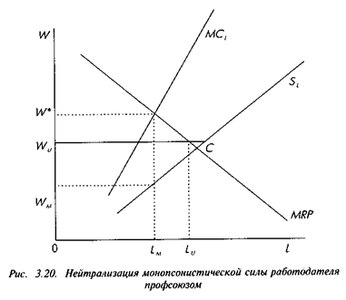В условиях монопсонии возможны положительные эффекты минимальной заработной платы на занятость и заработную плату. На рис. 3.19 минимальная заработная плата Wmin установлена на уровне, превышающем монопсонистически равновесный уровень заработной платы WM . При этом кривая предложения труда примет вид кривой Wmin CSL , а кривая предельных издержек – Wmin CBMCL . Уровень занятости L’ определяется условием максимизации прибыли и соответствует горизонтальным координатам точки D, в которой MCL = MRP (где MCL – новая кривая предельных издержек Wmin CBMCL ) и L’>LM . Положительный эффект минимальной заработной платы на занятость будет сохраняться при установлении Wmin в интервале WM < Wmin < W*, где W* = MCL = MRP – заработная плата, равная предельным издержкам, когда они равны предельному денежному продукту труда до установления минимальной заработной платы. 9. Двусторонняя монополия на рынке труда Двусторонней монополией на рынке труда называется случай, когда работодатель является единственным покупателем труда (монопсонистом), а продавец труда обладает монопольной силой (например, работники, объединенные в профсоюз). Профсоюз может нейтрализовать монопольную силу работодателя-монопсониста, предлагая труд своих членов по единой определенной заработной плате и создавая участок совершенно эластичного предложения труда. В этом случае будет возникать эффект, аналогичный эффекту минимальной заработной платы на монопсонистическом рынке труда. На рис. 3.20 профсоюз устанавливает заработную плату на уровне WU , тогда кривая предложения труда примет вид WU CSL , и пересечение ее с кривой MRP определит уровень занятости LU , т.е. монопольные действия профсоюза позволили увеличить уровень занятости и заработной платы по сравнению с соответствующими уровнями монопсонистического равновесия (LM , WM ). Как и в случае минимальной заработной платы, положительное влияние профсоюза при определении им заработной платы на монопсонистическом рынке труда ограничено интервалом WM < Wmin < W*, где W* = MCL = MRP – заработная плата, равная предельным издержкам, когда они равны предельному денежному продукту труда до действия профсоюза.
