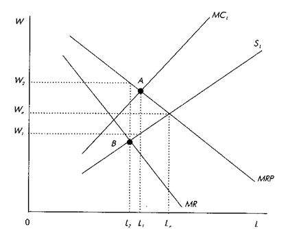 Подстройка на рынке труда возникает в ответ на избыток или нехватку труда. Нехватку на рынке труда можно рассматривать как ситуацию, когда спрос превышает предложение при доминирующей текущей заработной плате и заработная плата имеет тенденцию к повышению (избыток определяется как обратная ситуация, когда предложение превосходит спрос). При нехватке доминирующая заработная плата ниже равновесной, показателем нехватки служит разность между объемом спроса на труд и предложения труда при доминирующей заработной плате. Объем нехватки может быть оценен с помощью показателей занятости, безработицы, вакансий. Однако следует учесть, что на локальных рынках труда сложность подстройки рынка будет определяться не только размерами нехватки, но и тем, насколько велик разрыв между доминирующей и равновесной заработной платой. Чем больше этот разрыв, тем сложнее подстройка рынка. При прочих равных условиях величина этого разрыва будет прямо зависеть от эластичности спроса на труд и предложения труда. Так, на рис. 3.6 показана ситуация на двух примерно равных по объему рынках труда, где LA *= LB *, испытывающих нехватку при доминирующей заработной плате WA 0 = WB 0 . На рынке труда А размер нехватки превышает нехватку на рынке труда В [(LA 0 – LA 1 )>(LB 0 – LB 1 )), но поскольку разрыв между уровнями доминирующей и равновесной заработной платы на рынке труда В больше, чем на рынке труда А [(WB * - WB 0 ) > (WA * - WA 0 )], то, вероятно, процесс подстройки на рынке В будет осуществляться сложнее, чем на рынке А. 4. Монопсония на рынке труда Монопсония на рынке труда – это ситуация, когда существует только один покупатель данного вида труда, один работодатель. В этом случае работодатель (при предположении о совершенной конкуренции со стороны продавца труда) сталкивается с рыночной кривой предложения труда, имеющей положительный наклон, и вынужден нанимать каждую последующую единицу труда по цене ее предложения. При недискриминирующей монопсонии работодатель всем работникам платит одинаковую заработную плату, равную средним издержкам на труд (АСL ), но для найма дополнительной единицы труда он должен предложить более высокую заработную плату, чем уже платит, и новому работнику, и прежним. При монопсонии ставка заработной платы и предельные издержки на труд являются возрастающими функциями от количества используемого труда W = f(L), MСL = g(L). Кривая предельных издержек на труд MСL , отклоняется от кривой предложения труда SL и расположена круче. Из условия максимизации прибыли следует MRP = MСL . В условиях монопсонии издержки C(L) = W(L) L. MСL = ¶C / ¶L = W + L * ¶W / ¶L = W (1 + L / W * ¶W/ ¶L) = W (1 + l /eS ), где eS = ¶L / L / ¶W / W – эластичность предложения труда. Уровень занятости при монопсонии LM определяется условием максимизации прибыли и соответствует горизонтальным координатам точки А на рис. 3.7, в которой MCL = MRP. Ставка заработной платы WM определяется для этого уровня занятости, исходя из кривой предложения труда и соответствует вертикальным координатам точки В на рис. 3.7. Уровень занятости и ставка заработной платы при монопсонии меньше уровня занятости и ставки заработной платы, соответствующих совершенно конкурентному рынку труда.
