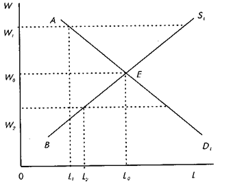 Рис. 3.21. Двусторонняя монополия 10. Неравновесный рынок труда конкуренция спрос монополия неравновесный труд Модель равновесного рынка труда основывается на том, что в точке равновесия DL (W*) = SL (W*)= L*, и равновесная заработная плата W* «очищает рынок», т.е. нет ни избыточного спроса, ни избыточного предложения. Модель неравновесного рынка труда исходит из того, что уровень занятости определяется «короткой стороной рынка», или спросом на труд, или предложением труда, в зависимости от того, что из них меньше при данной заработной плате, L = min (DL , SL ). Кривые спроса и предложения труда в этой модели могут быть интерпретированы как отражающие максимальное количество труда, которое может быть обменено при данной ставке заработной платы. На рис. 3.22 видно, что при ставке заработной платы W1 (больше равновесной заработной платы, W1 > W0 ) работодатели не захотят в соответствии с кривой спроса на труд DL нанять больше работников, чем L1 , т.е. количество труда определено спросом на труд, несмотря на то, что предложение труда больше. При ставке заработной платы W2 (меньше равновесной заработной платы, W2 < W0 ) предложение труда будет меньше, чем спрос на труд, но работодатели наймут предложенное количество труда, потому что в этой ситуации они получат прибыль. Предельный денежный продукт при уровне занятости L2 превысит заработную плату, т.е. количество труда определено предложением, несмотря на то, что спрос на труд больше. В противоположность равновесной модели рынка труда, которая предполагает существование единственной комбинации заработной платы и занятости в точке Е, неравновесная модель предполагает, что комбинаций заработной платы и занятости может быть много и они определяются линией AЕВ. Поведение заработной платы в неравновесной модели описывается уравнением Wt = Wt - 1 + у (DL - SL ), у >0. Скорость, с которой заработная плата стремится к равновесной, определяется параметром у. Если у велик, то рынок труда быстро движется к равновесию, если у мал, то неравновесная ситуация на рынке труда сохраняется значительное время. Направление движения заработной платы служит в данном случае точным указателем того, что является сдерживающим фактором – спрос или предложение. Если заработная плата растет, то занятость определяется предложением труда, если снижается – спросом на труд.