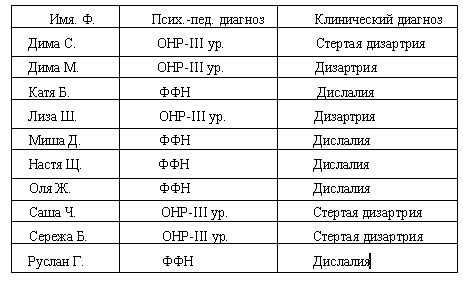 Дети с ОНР III ур. – 50% Дети с ФФН – 50% Для детей с ФФН данной подгруппы характерно неправильное произношение звуков. Сложные по артикуляции звуки дети заменяют более простыми: [Л- В]; [ Р- Й] ( Руслан Г. парта – пайта , сковорода – квайада ; Миша Д. лоб – воб , вобик ); по специальному требованию звуки произносят правильно, но в речи их смешивают: [С-Ш]; [З-Ж]; [С-З]; [Ш-Ж] ( Оля Ж.вежливый – вешливый, живет- зывет; Настя Щ. трусливый – трушивый, два стула – два штула ); наблюдается нестойкое употребление звуков в речи, один и тот же звук произносят по разному [С-Ш]; [С-З] (Катя Б. носок – ношок , сабор –забор ); одним и тем же звуком заменяют другие звуки: [Ч-ТЬ]; [Ш-ТЬ] (Руслан Г. чашка-тяшка, шапка- тяпка); у двоих детей наблюдается искаженное произношение звука [Р]- горловое (Миша Д., Катя Б). Неправильное произношение звуков связано с недостаточным их различением, так у детей отмечается неточное воспроизведение слоговых рядов, слов с оппозиционными звуками ( Катя Б. па-ба-па – па-па-па , коза-коса – коса-коса ; Настя Щ. са-ша-са – са-са-ша , мишка–миска – миска –мишка ). Недостаточность фонематического слуха, восприятия проявляется и при выполнении специальных заданий направленных на выделение звука. Дети ошибаются при выделении заданного звука, слога или слова, в подборе картинок на заданный звук, не могут подобрать слово на определенный звук, выделить и определить место звука в слове. Отмечаются трудности при произнесении многосложных слов и слов со стечением согласных ( Настя Щ. велосипед – весипед, милиционер – мицинер , Миша Д. тряпка – тяпка, тыква – тыва ). У детей этой подгруппы отмечается бедность словаря, незначительная задержка в формировании грамматического строя речи (Оля Ж. поезда- поежды ), ошибки в употреблении сложных предлогов ( Миша Д. выкатился из-под стула – выкатився из стува ). У детей с ОНР III уровня развития речи отмечается фонетические и фонематические нарушения речи. Дети заменяют одним звуком два и более: ( Дима С. [С-С]; [Ш-С] шуба – сюба , собака – сябака ); отмечаются смешения, искажения звуков: ( Лиза Ш.- межзубный сигматизм свистящих и шипящих; Саша Ч. – ротацизм, ламбдацизм; Дима С.– ламбдацизм, ротацизм; Сережа Б.– дефект смягчения; Дима М. – речь нечеткая, смазанная, артикуляция сжатая, наблюдается спастика мышц губ). Недостаточность развития фонематического слуха ведет к сниженной дифференциации звуков на слух, дети не могут правильно повторить слоги с парными согласными, не различают слова паронимы, не могут выделить заданный звук из ряда слогов, слов. Недостаточность сформированности фонематического восприятия отмечается у всех детей; одни затрудняются в выделении конечного согласного (Дима С., Дима М.) другие не могут выделить гласный из середины слова типа «мак» (Сережа Б., Саша Ч.), гласный в конце слова; так же затрудняются в подборе слов, картинок на заданный звук, найти место звука в слове. У детей этой подгруппы отмечаются недостатки словарного запаса. Среди лексических ошибок можно выделить замену названия части предмета названием целого (Дима С.– спинка стула – стув, носик чайника – чайник ); замену названий профессий названием действий (Дима М. – летчик – летит на шамолете , строитель – строит дом ); взаимозамещение признаков (Лиза Ш. – высокий, широкая, длинный – большой ). Дети допускают очень много ошибок в словообразовани