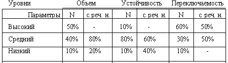 Таблица 6. Сравнение уровней развития основных свойств внимания у детей с речевыми нарушениями и у детей с нормальным речевым развитием.