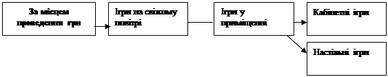 Рис. 1. Класифікація ігор Використовуючи гру як засіб формування в учнів нових знань, умінь і навичок, вчитель наповнює її дидактичним змістом – вносить в ігрову діяльність певний навчальний матеріал, перетворюючи гру-розвагу на дидактичну гру. У сучасній теорії навчання існують різні підходи до визначення дидактичного статусу ігор. Одна група науковців відносить гру до методів навчання. Інша категоризує її як прийом навчання. Ми поділяємо погляди обох груп учених, оскільки у тому разі, коли дидактична гра застосовується як допоміжний елемент методу навчання (у процесі бесіди, практичної роботи, пояснення тощо), її можна вважати прийомом навчання. З іншого боку, якщо у процесі ігрової діяльності передбачено використання інших методичних засобів (наочності, розповіді, пояснення тощо), то дидактичну гру можна віднести до категорії методів навчання. Існують думки, що розглядають гру як форму навчання. З такою позицією можна погодитись, адже в дидактичному розумінні форма навчання – це спеціально організована діяльність вчителя й учнів, яка відбувається за встановленим порядком у певному режимі. До цієї категорії відносять уроки, семінари, екскурсії, заняття тощо. Кожна із цих форм може бути успішно реалізована у вигляді дидактичної гри, оскільки у процесі її організації створюються умови для засвоєння учнями змісту освіти під керівництвом учителя за певними правилами, порядком і регламентом. З точки зору О. Я. Савченко та інших учених, дидактична гра – це засіб навчання, оскільки вона спрямована на засвоєння й використання конкретних знань, умінь, навичок і є механізмом навчання, основний педагогічний зміст та призначення якого – навчати діяти. Дидактична гра є засобом цілеспрямованого керівництва викладачем розумовою діяльністю учнів, а також засобом формування тих пізнавальних структур, які забезпечують можливість самостійно регулювати розумову діяльність [25]. Ми поділяємо точку зору тих учених, які розглядають дидактичну гру як засіб навчання і вважаємо за необхідне уточнити саме такий підхід у зв’язку з об’єктом нашого дослідження. Насамперед, необхідно зазначити, що дидактична гра є засобом, який активізує пізнавальну діяльність, унаслідок чого учні мають можливість використати свої знання, уміння й навички у практичній діяльності. Сутність дидактичної гри як засобу засвоєння знань виявляється в її здатності успішно реалізовувати мету навчання, досягати реальних результатів, оволодівати досвідом творчої діяльності, моральних та інших якостей особистості. Ця здатність полягає в ігровому моделюванні конкретних видів діяльності (навчально-пізнавальної, науково-дослідницької, професійної тощо), що спрямовані на відтворення і засвоєння соціального досвіду, внаслідок чого відбувається формування творчої, активної, соціальної та компетентної особистості. В науці відома також значна кількість визначень дидактичної гри. Не існує єдності й щодо термінів “педагогічна гра”, “навчальна гра”, “дидактична гра”, “пізнавальна гра”. У певному значенні ці назви деколи можна розглядати синонімічними. В широкому розумінні всі ігри є навчальними, оскільки з їх допомогою можна навчити особистість виконувати певні дії. Будь-яка гра є пізнавальною, бо, граючись, людина пізнає оточуючий її світ, якості, властивості п