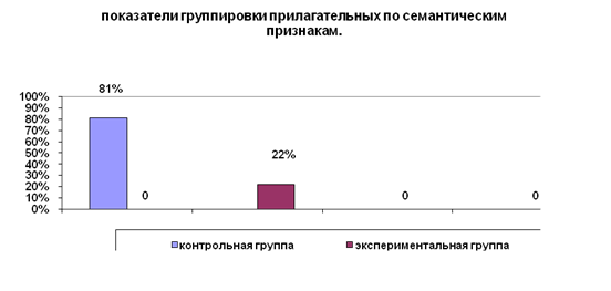 Вывод: Сравнив результаты, полученные при исследовании активного и пассивного словаря детей, можно сделать следующие выводы: объем пассивного словаря у детей контрольной группы незначительно больше объема активного, а у детей экспериментальной группы объем пассивного словаря шире объема активного словаря. · Третье задание было направлено на исследование процессов группировки прилагательных по семантическим признакам. Полученные результаты показали, что в отличие от детей контрольной группы дети экспериментальной группы затрудняются в дифференциации прилагательных по семантическим близким признакам. Они при выполнении задания допускали ошибки т. к. не могли выделить основной семантический признак значения слова. Правильно ответить не смог не один ребенок из экспериментальной группы дети выполняли задание по аналогии, не противопоставляя заданные понятия. Данные представлены в диаграмме 3.