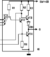 Рис. 2. Базова схема елемента "І–НІ" ТТЛ схеми з резистором в колекторі вихідного транзистора (а) і її умовне позначення (б). Для збільшення логічних можливостей ТТЛ-схем до виводів від точок 1 і 2 інвертора під'єднується логічний розширювач (рис.2,а); при цьому реалізується логічна функція "І-АБО-НI”: