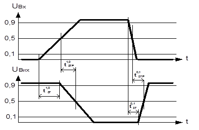 a) б) Рис.2. Логічний розширювач (а) і умовне графічне позначення логічної схеми “І – АБО – НІ” (б). Поняття додатньої і від'ємної логіки. В додатній логіці лог. " 1" відповідає високий рівень цифрового сигналу, лог. "О" - низький рівень. Тому один і той самий елемент наприклад мікросхеми К155ЛАЗ відповідає двом логічним функціям, в нашому прикладі це функція "І-НГ для додатньої логіки і - "АБО-НI для від'ємної логіки. Основні електричні параметри базових логічних елементів (ЛЕ) визначають характеристики практично всіх мікросхем, що входять до конкретної серії, і визначають можливість сумісної роботи мікросхем різних серій в складі апаратури. До таких параметрів відносяться: · швидкодія; · споживна потужність (РСП ); · завадостійкість (Uзв ); · коефіцієнт розгалуження по виходу (навантажувальна здатність) (КРОЗ ); · коефіцієнт об'єднання по входу (КоБ ). Швидкодія визначається динамічними параметрами цифрових мікросхем, до яких відносяться: · t 0,1 – час переходу їз стану низького рівня в стан високого рівня; · t 1,0 ЗТР – час затримки розповсюдження при включенні; · t 1,0 ЗТ – час затримки включення; · t 0,1 ЗТ – час затримки виключення; · t 0,1 ЗТР – час затримки розповсюдження сигналу при виключенні; · tЗТРСР – середній час затримки розповсюдження сигналу; · tі – тривалість імпульсу; · Fр - робоча частота. Середній час затримки розповсюдження t ЗТРСР = 0,5 (t1,0 ЗТР + t0,1 ЗТР ) є усередненим параметром швидкодії, що використовується при розрахунку часових характеристик послідовно включених цифрових мікросхем. В довідникових даних найбільш часто приводяться наступні динамічні параметри цифрових мікросхем: t1,0 зт, t0,1 зт , t1,0 зтр, t0,1 зтр. На рис.3. показані рівні відліків, відносно яких визначаються вказані динамічні параметри.