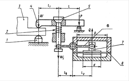 2.3.2 Определение схемы зажима объектаСиловое замыкание для закрепления заготовки в нашем случае должно быть направлено на горизонтальную установочную плоскость. Для надежного обеспечения определенности базирования объекта рекомендуется силовое замыкание направлять на каждую из силовых опор. Однако для упрощения приспособления желательно прикладывать силы зажима на одну координатную плоскость, построенную на установочной базе. Эту точку приложения силы выбираем равноудаленной от каждого из установочных элементов. Так как заготовка имеет небольшую массу и силы, возникающие при обработке, приводят к нарушению положения заготовки, то необходимо применить зажимное устройство. Зажимное устройство предназначено для устранения возможности вибрации или смещения заготовки относительно установочных элементов приспособления под действием собственного веса и сил, возникающих в процессе обработки. Используем в качестве зажимного устройства комбинированный зажим с пневматическим приводом (рис.2.3). Принцип его действия таков. При подаче сжатого воздуха в нижнюю часть пневмокамеры мембрана 8 прогибается и шток 7, жестко связанный с мембраной, поворачивая рычаг-усилитель 6 на оси, правое его плечо поднимает, а левое - опускает. Рычаг 6 левым плечом опускает стержень 5 с планкой 4 и планка левым плечом зажимает заготовку 3, установленную на опорах 1. При подаче сжатого воздуха в верхнюю часть пневмокамеры мембрана 8 прогибается вниз, и шток 7 поворачивая рычаг-усилитель 6 на оси, перемещает правое его плечо вниз, а левое - вверх. В этом случае рычаг левым плечом поднимает стержень 5, и он прекращает нажим на планку 4 и деталь освобождается. Пружина 2 поднимает прихват 4 и прижимает его к верхней головке стержня 5.