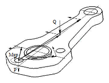 Рис. 2.4. К расчету силы зажима Во-вторых, определим силу Q, необходимую для зажима заготовки, для чего составим уравнение статического равновесия твердого тела. Расчет проведем для первого отверстия (рис.2.4). На тело действуют сила резания P и сила закрепления заготовки Q. Тело будет находиться в состоянии равновесия, если будет выполняться равенство K · Mкр = f2 · P/3 · r1 + f2 · P/3 · r2 + f2 · P/3 · r3 + f2 · Q/3 · r1 + f2 · Q/3 · r2 + f2 · Q/3 · r3 + f1 · Q · r4 Откуда Q = [K · Mкр - f2 · P/3 · (r1 + r2 + r3 )] / [f2 /3 · (r1 + r2 + r3 ) + f1 · r4 ] (2.1) где f1 = f2 = 0.1 - коэффициенты трения между поверхностями заготовки и установочными и зажимными элементами; r1 , r2 , r3 , r4 - соответствующие длины плеч. Для первого отверстия r1 = 33 мм, r2 = 21 мм, r3 = 79 мм, r4 = 46 мм, а значение силы зажима, рассчитанное по формуле 2.1, Q ≈ 140 H. Для второго отверстия r1 = 13 мм, r2 = 36 мм, r3 = 52 мм, r4 = 22 мм, а значение силы зажима, рассчитанное по формуле 2.1, Q ≈ 493 H. Поэтому для надежной фиксации заготовки в приспособлении необходимо приложить силу зажима Q = 500 H. Для того чтобы создать такое зажимное давление на заготовке, необходимо приложить на шток пневмокамеры силу (рис.2.3) W = Q·l3 · (l1 + l) / (l2 · l · η) где η - коэффициент, учитывающий трение в шарнирных соединениях и в пневмокамере; l2 и l3 - длины плеч рычага-усилителя; l1 и l - длины плеч прижимного рычага (планки). Принимаем η = 1, l1 = 50 мм, l2 = 120 мм, l3 = 120 мм, l = 50 мм. Тогда W = 500 · 120 · (50 + 50) / (120 · 50 · 1) = 1000 H.
