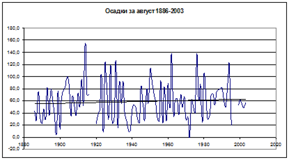 Рис. 8.3.2. Количество осадков за период с температурами ниже -100 и линейный тренд. Это еще раз подчеркивает, что на осадки оказывает влияние большее количество факторов по сравнению с температурой. Рассмотрим также, как менялись суммы активных температур (арифметическая сумма среднесуточных температур свыше +100 С) и температур выше +150 C.