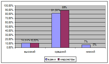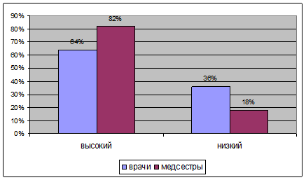 Из таблицы 1 видно, что у большинства медицинских работников низкий уровень как общей интернальности, так и интернальности в профессиональной деятельности: он выражен у 64% врачей и 80% медсестер. Это говорит о проявлении у них экстернальности. Для них свойственно внешне направленное защитное поведение. Любая ситуация экстерналу желательна как внешне стимулируемая, причем в случаях успеха происходит демонстрация своих способностей и возможностей. Они убеждены, что их неудача является результатом невезения, случайностей, отрицательного влияния других людей. Одобрение и поддержка таким людям весьма необходимы. Однако особой признательности за сочувствие от них ожидать не приходится. Высокий уровень имеют 36% врачей и 18% медсестер, что говорит о проявлении интернальности. Данные медицинские работники чаще всего имеют убеждение в неслучайности их успехов или неудач, зависящих от компетентности, целеустремленности, уровня способностей и являющихся закономерным результатом целенаправленной деятельности и самодеятельности. Они имеют более широкие временные перспективы, охватывающие значительное множество событий, фактов, как будущего, так и прошлого. При этом их поведение направлено на последовательное достижение успеха путём развития навыков и более глубокой обработки информации, постановки все возрастающих по своей сложности задач. Потребность в достижении, таким образом, имеет тенденцию к повышению, связанную с увеличением значений личностной и реактивной тревожности, что является предпосылкой для возможной большей фрустрированности и меньшей стрессоустойчивости в случаях серьезных неудач. Однако в целом, в реальном, внешне наблюдаемом поведении интерналы производят впечатление достаточно уверенных в себе людей, тем более что в жизни они чаще занимают более высокое общественное положение, чем экстерналы. Эти люди считают, что всё чего они добились в жизни, является результатом их труда и заслуг. Выраженность локуса контроля у медицинских работников представлена на рисунке 1.