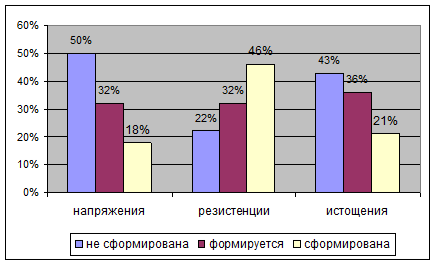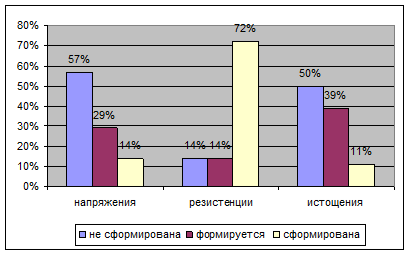 Рис 3. Сформированность фаз СЭВ у врачей. Из рисунка 4 мы видим, что у большинства медсестер (72%) также как и у врачей сформирована фаза резистенции, в то время как фазы напряжения и истощения у большинства не сформированы (57% и 50% соответственно) В стадии формирования фаза напряжения находится у 29% испытуемых, фаза резистенции у 14%, а фаза истощения у 39%. Это также свидетельствует о том, что медсестры также как и врачи испытывают психоэмоциональное напряжение, вызывающее синдром эмоционального выгорания.