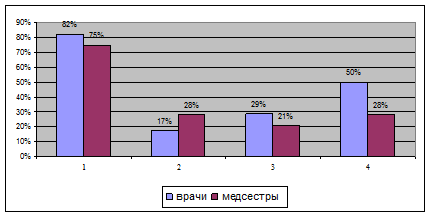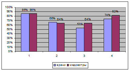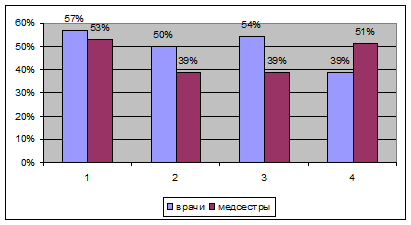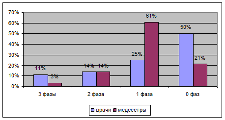 У большинства медицинских работников фаза "истощения", находится в стадии формирования. Данная фаза характеризуется более или менее выраженным падением общего энергетического тонуса и ослаблением нервной системы. Эмоциональная защита в форме “выгорания” становится неотъемлемым атрибутом личности. Из таблицы 5 мы видим, что симптом "эмоционального дефицита" сформирован у 29% врачей и 21% медсестер, у большинства медсестер (46%) и врачей (43%) данный симптом не сформирован. Данный симптом проявляется в уверенности, что эмоционально человек уже не может помогать субъектам своей деятельности. Не в состоянии войти в их положение, соучаствовать и сопереживать, отзываться на ситуации, которые должны трогать, побуждать, усиливать интеллектуальную, волевую и нравственную отдачу. О том, что это не что иное, как эмоциональное выгорание, говорит его еще недавний опыт: некоторое время тому назад таких ощущений не было, и личность переживает их появление. Постепенно симптом усиливается и приобретает более осложненную форму: все реже проявляются положительные эмоции и все чаще отрицательные. Резкость, грубость, раздражительность, обиды, капризы - дополняют симптом "эмоционального дефицита". Симптом "эмоциональной отстраненности" сформирован у 29% врачей и лишь у 3% медсестер, у 21% врачей и 36% медсестер, симптом не сформирован, при этом у большинства медицинских работников данный симптом не сформирован. В случае сформированности данного симптома врачи полностью исключают эмоции из сферы профессиональной деятельности. Их почти ничего не волнует, почти ничто не вызывает эмоционального отклика - ни позитивные обстоятельства, ни отрицательные. Причем это не исходный дефект эмоциональной сферы, не признак ригидности, а приобретенная за годы обслуживания людей эмоциональная защита. Человек постепенно учится работать как робот, как бездушный автомат. В других сферах он живет полнокровными эмоциями. Реагирование без чувств и эмоций наиболее яркий симптом "выгорания". Он свидетельствует о профессиональной деформации личности и наносит ущерб субъекту общения. Пациенты таких медицинских работников обычно переживают проявленное к ним безразличие и могут быть глубоко травмированы. Симптом "личностной отстраненности, или деперсонализации" сформирован у 29 % врачей и 7 % медсестер, у большинства медработников он также как и предыдущий симптом не сформирован. Данный симптом проявляется в широком диапазоне умонастроений и поступков профессионала в процессе общения. Прежде всего, отмечается полная или частичная утрата интереса к человеку - субъекту профессионального действия. Он воспринимается как неодушевленный предмет, как объект для манипуляций - с ним приходится что-то делать. Объект тяготит своими проблемами, потребностями, неприятно его присутствие, сам факт его существования. Возникает деперсонализированный защитный эмоционально-волевой антигуманистический настрой. Личность утверждает, что работа с людьми не интересна, не доставляет удовлетворения, не представляет социальной ценности. Симптом "психосоматических и психовегетативных нарушений" сформирован у 21% врачей и медсестер. У большинства медицинских работников он так же не сформирован. Данный симптом проявляется на уровне физического и психического самочувствия. Обычно он образ