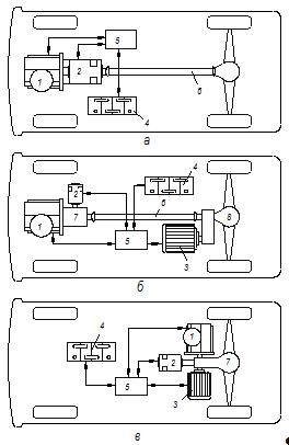 Рисунок 1.1 – Послідовна кінематична схема автомобіля з КЕУ: 1 – ДВЗ; 2 – мотор-генератор; 3 – тяговий електродвигун; 4 – акумуляторна батарея; 5 – система регулювання; 6 – карданна передача. Виключення із привода КП, зчеплення й карданного вала дозволяє істотно знизити обертові маси й загальну масу силового устаткування. Зниження моменту інерції впливає на процес нерівномірно-поступального руху машини. Значний вплив на момент інерції обертових мас робить передавальне число передачі. Оскільки коефіцієнт врахування обертових мас пов'язаний з передаточним числом КП квадратичною залежністю, то зі зменшенням передаточного числа істотно знижуються умовна маса машини й необхідна для розгону потужність. Конструкторів приваблює можливість більш вільного компонування: не пов'язані з колесами ДВЗ і мотор-генератор можуть розміщатися там, де це найбільше зручно. Відсутність кінематичного зв'язку ДВЗ із ведучими колесами дозволяє по-новому підійти до проектування ДВЗ і мотор-генератора. У зв'язку із цим відзначимо можливість створення вільнопоршневих (без колінчатого вала й кривошипно-шатунного механізму) ДВЗ і мотор-генераторів з лінійним переміщенням ротора. Послідовна кінематична схема гібридних машин дозволяє застосовувати нові конструкторські рішення, нові компонування. Послідовна схема дає можливість виключити диференціал, що затрудняє побудову якісної системи керування рухом й погіршує керованість й прохідність АТЗ. Відзначимо, що така схема застосовується в конструкції важких АТЗ (наприклад, у кар'єрних самоскидах надвеликої вантажопідйомності). З'являється можливість виключення механічних редукторів, що зв'язують як ДВЗ із мотор-генератором, так і тяговий електропривід з ведучими колесами ("прямий" привід генератора й ведучих коліс). У гібридному АТЗ із мотор-колесами загальне зниження маси за рахунок виключення механічних вузлів, навіть із обліком додатково встановлюваних мотор-генератора й буферного накопичувача, може бути значним. Воно приводить до зменшення необхідної потужності ДВЗ і до додаткової економії палива. Економія, що досягається при цьому, може перекривати втрати, пов'язані з подвійним перетворенням енергії. 1.2.2 Паралельна схема У паралельній схемі як електропривід може використовуватися мотор-генератор, з'єднаний з колінчатим валом ДВЗ, що дозволяє вимикати ДВЗ при нетривалій зупинці АТЗ і наступному пуску ДВЗ по команді водія почати рух (рисунок 1.2, а). Мотор-генератор доцільно використовувати не тільки для швидкого пуску ДВЗ, але й для створення електротяги при рушанні АТЗ із місця. Причина цього очевидна: ДВЗ має високу паливну ефективність і малий рівень викидів в обмеженому діапазоні частот обертання, тому доцільно відбирати від нього потужність тільки після того, як машина вже набере деяку мінімальну швидкість. Мотор-генератор дозволяє "згладжувати" пульсації моменту, що розвиває ДВЗ (що сприятливо позначається на зниженні вібрацій), і збільшувати ресурс вузлів трансмісії. Одночасно може бути вирішена проблема дефіциту потужності бортової електромережі, характерна для сучасних АТЗ. Кращі результати й більшу гнучкість керування дає схема з додатковими (крім мотор-генератора) тяговим електродвигуном з інвертором, редуктором і механічною муфтою (з електронним керуванням), що дозволя